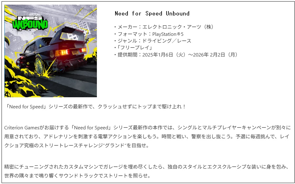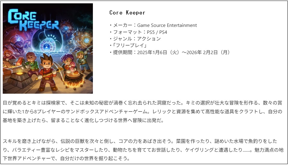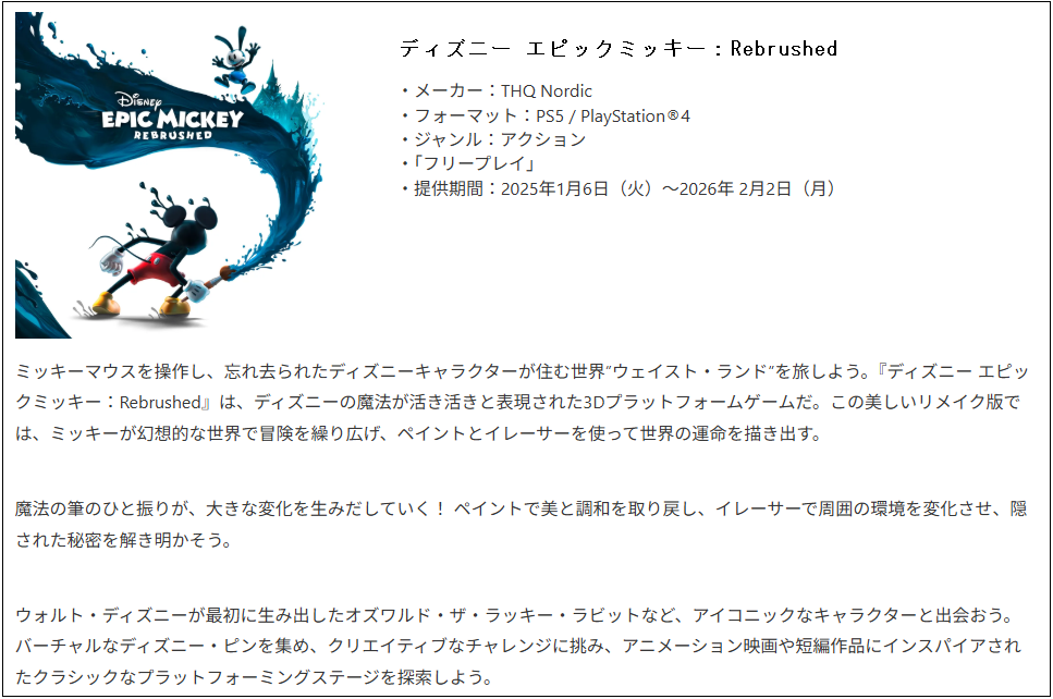 【PS Plus】1月フリープレイ【2026】 2026.01.05 CSゲーム PS Plusゲーム Need for Speed Unbound ディズニー エピックミッキー:Rebrushed Core Keeper おわりに 2026年最初のフリプは無事?PS4のがまだある。 まだまだ遊べるPS4って事で楽しんでいこう♪ そんなわけで遅いけど、あけましておめでとうございます!