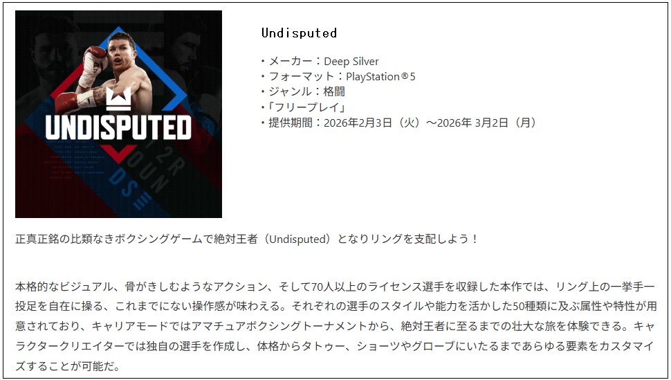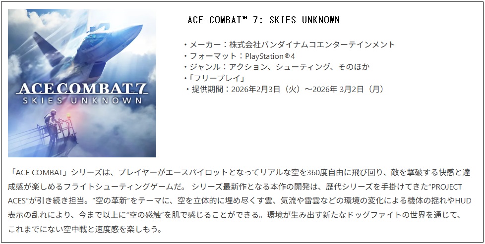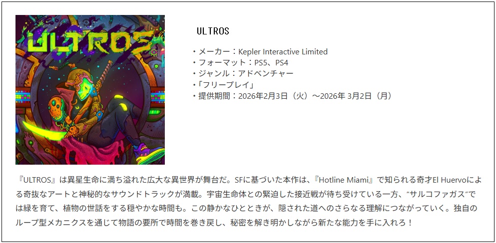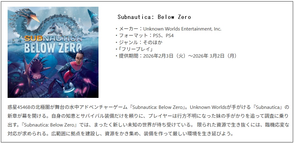 【PS Plus】2月フリープレイ【2026】 2026.01.30 CSゲーム PS Plusゲーム ACE COMBAT™ 7: SKIES UNKNOWN Undisputed Subnautica: Below Zero ULTROS おわりに 2月はいつもより多めでPS4で出来る作品も3つもあるしエースコンバットもある。 とはいえ、これらをやるかと問われたら1月フリプのcore keeperを楽しんでいたりする(笑) そんなわけだけど来月も楽しんでいこう♪